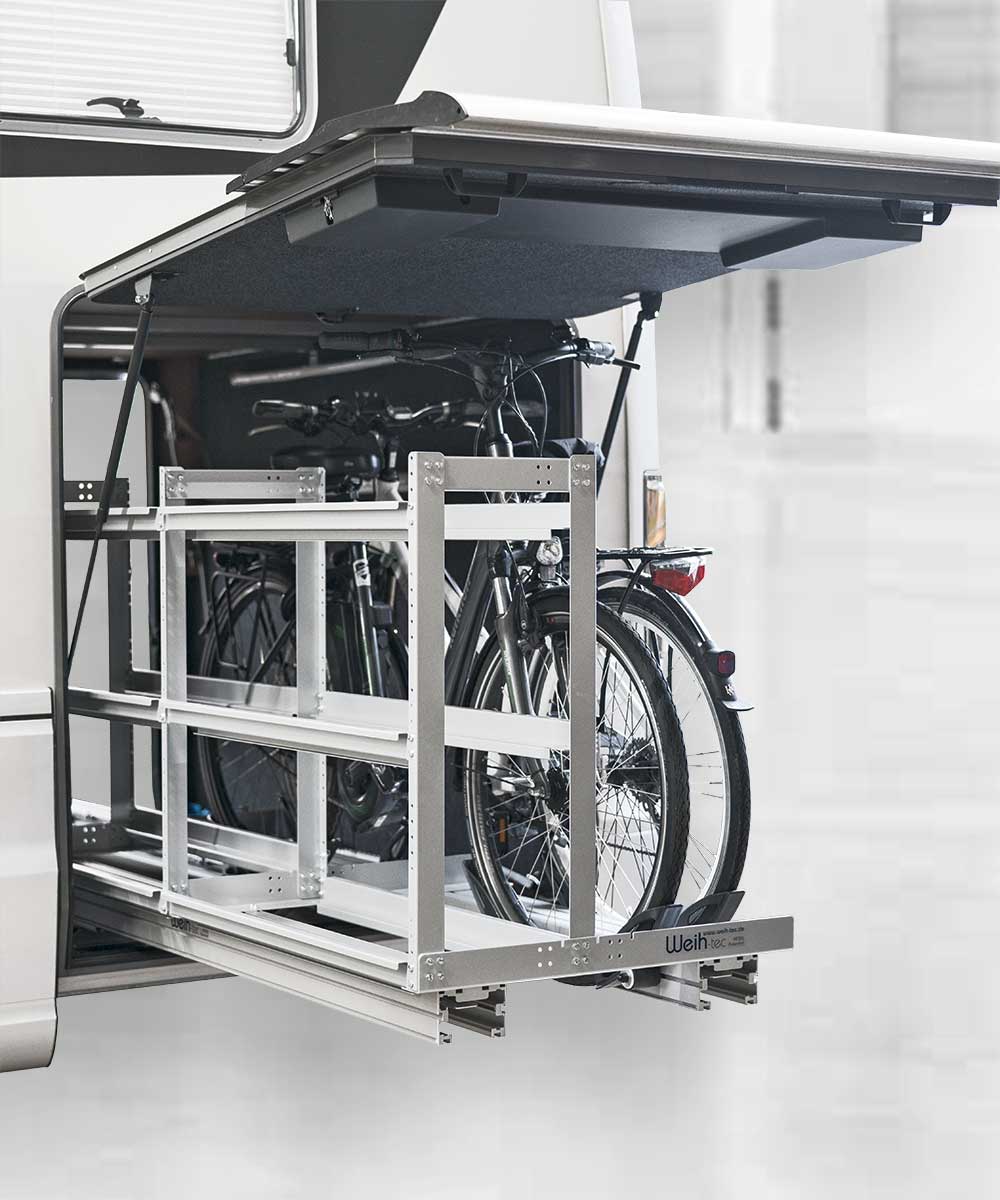 Für eine optimale Nutzung des Stauraums und um Ordnung in die Heckgarage zu bekommen, wurde dieses ausziehbare Regalsystem mit Fahrradträger aus Aluminium entwickelt.