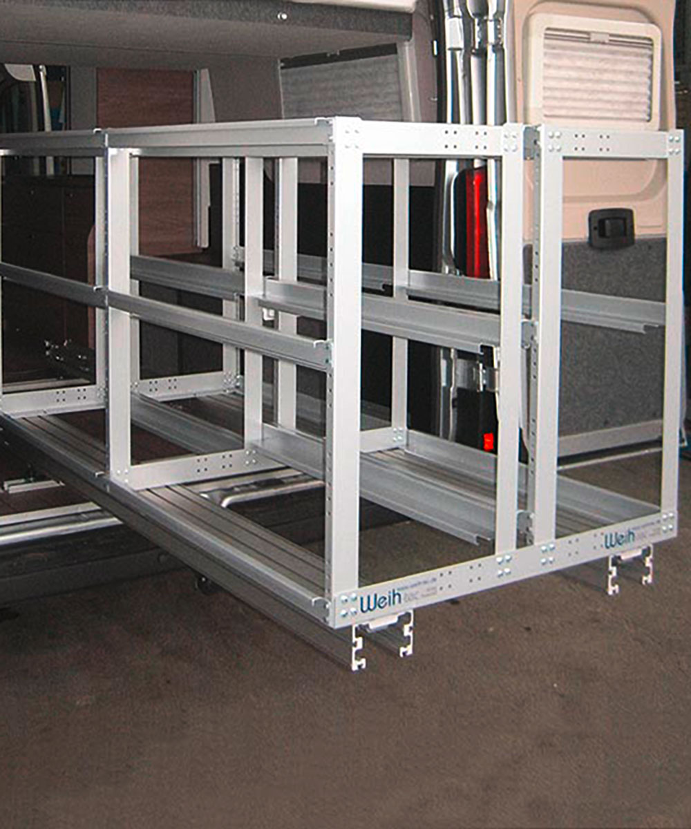 Für eine optimale Nutzung des Stauraums und um Ordnung in die Heckgarage zu bekommen, wurde dieses ausziehbare Regalsystem aus Aluminium entwickelt.